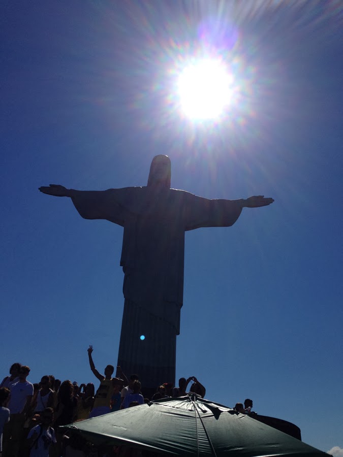 On Monday I rock climbed both the Pão de Açucar or SugarLoaf as well as the Corcovado on the top of which sits Cristo Redentor or Christ the Redeemer. This 30 meter statue is one of the most famous and recognizable icons in the world today. It is a huge symbol of Rio and although something like 1,300 people and hour visit it via tram or bus, few I think get to climb the side of the cliffs guarding its summit and cross the tourist barrier from outside in. You get some pretty interesting looks from the other tourists coming over the big railing onto the viewing platform while wearing climbing gear and dragging a rope. Ditto for the Sugarloaf, although for some reason it didn’t seem as dramatic. I’ll come back to the climbing a little later.