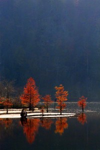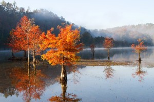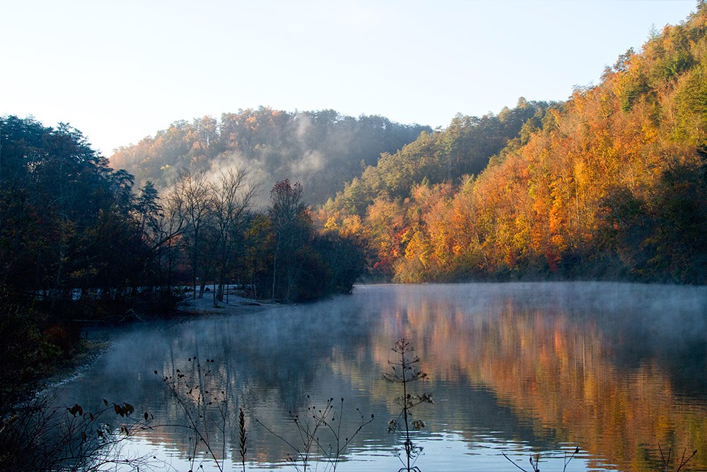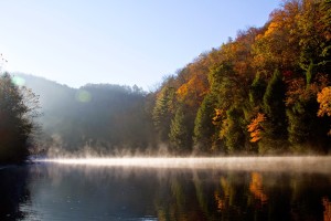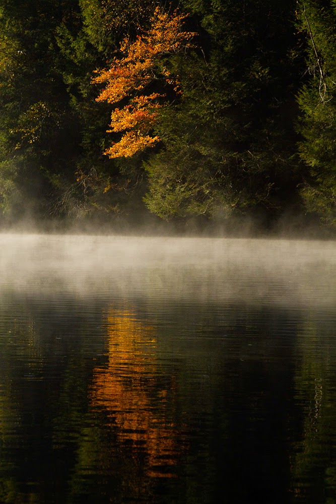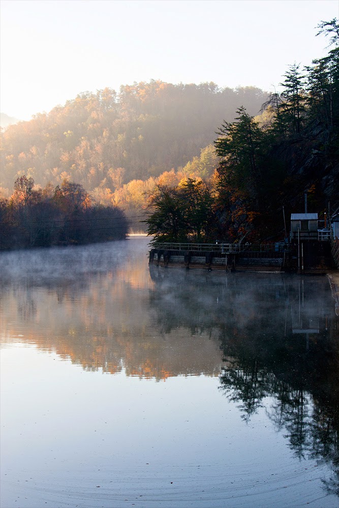 As the sun’s first incipient rays reached the hills and mountain tops surrounding the Ocoee River canyon, the contrast between the dark, flat lower regions with the warm full spectrum, fully saturated color palette painted by the Autumn leaves was incredible. The mist rose from the still waters between more turbulent stretches of river and gave the whole scene a wonderful quiet grace and soft nurturing mood.