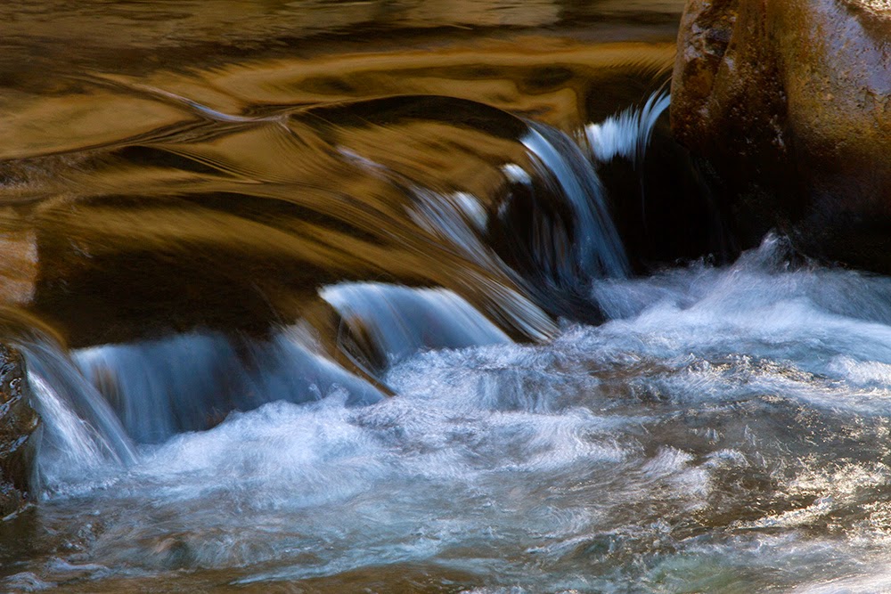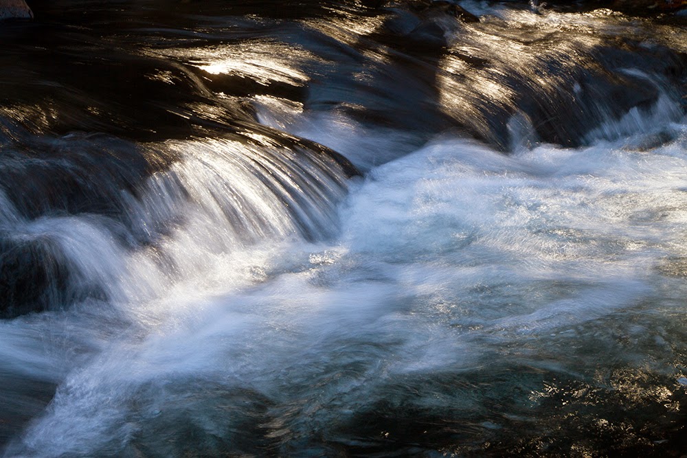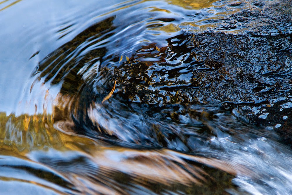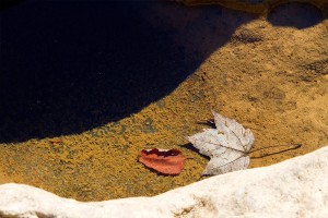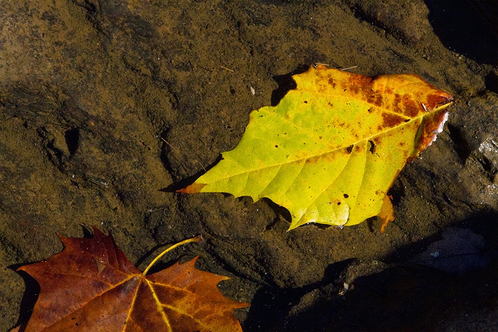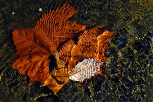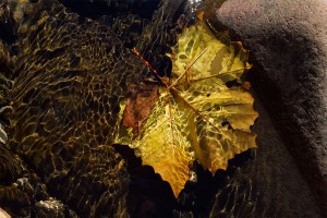 I noticed the fallen leaves in the river, some still floating and some waterlogged, drowned and resting on the bottom. Embraced and honored by the river, they made fascinating imagery as they interacted with the currents, patterns and textures of the water and rocks. I also loved the complex interplay of bright light reflecting off the surface while illuminating the depths below. I’ve always been fascinated by that sort of thing in water, store windows and car paint.