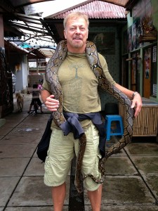 But I digress. This about the Petting Zoo and not small business enterprise. This is not the petting zoo most people are probably familiar with featuring fuzzy little bunnies and other fluffy woodland cuteness  for safe and fun handling by pre-schoolers. Nope. These are Pythons, Giant Scorpions and Fruit Bats, Monitor Lizards, Civet Cats (sort of like a cross between a Lynx and a Mongoose with pretty big teeth) and brightly colored birds that only seem interested in biting someones fingers off.
