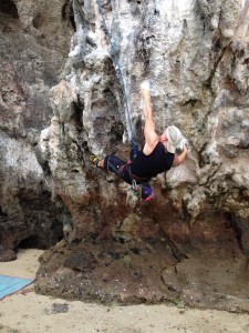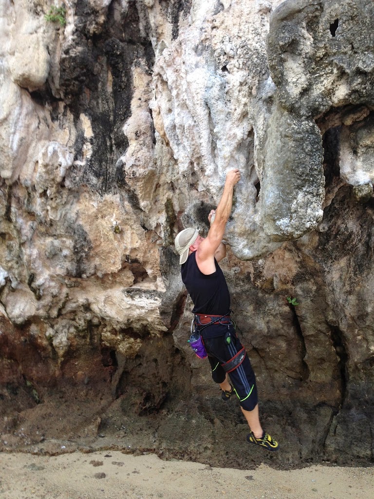 The picture above is a little hard to see, but what I am doing here is jumping up to grab the first holds on a giant stalagmite hanging over the sandy beach. Bit of a reach for me and then no footholds for a couple of pumpy pull-up type moves. It’s not technically hard, but pretty burly. I asked one of the guys I was climbing with to take some pics with my iPhone, but he wasn’t familiar with it and ended up taking several videos in the vertical format so most of my original ascent imagery is not really useful. Not sure if you can fix a vertical video like that, but highly doubtful. If anyone has any ideas, I’d love to hear em… 🙂