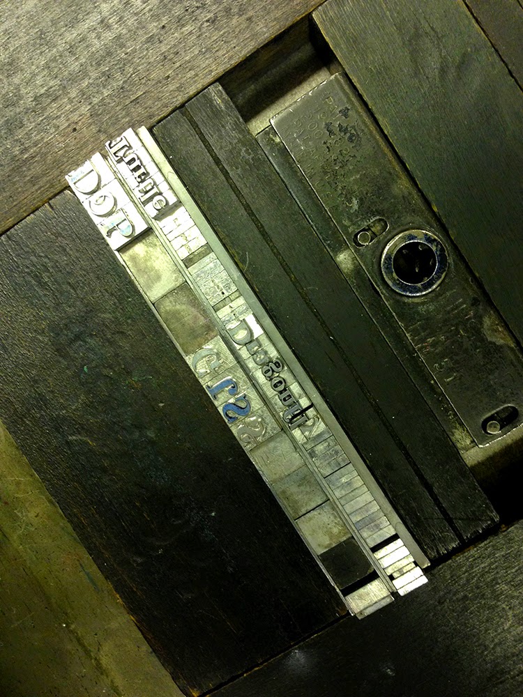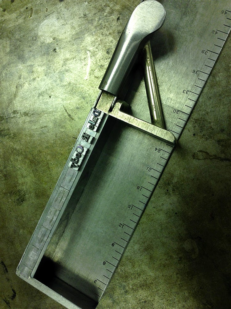 To create text and words in Letterpress, you have to assemble each metal letter called a “sort” backwards on lines using a metal composing stick. This is so they will print correctly when inked and run through the actual press. Each line or text is spaced or separated using a thin bar of metal called leading. So, for those of you out there familiar with typography, these will be familiar terms. Letterpress it turns out, is the genesis for many terms we commonly use today in design, word processing and printing.