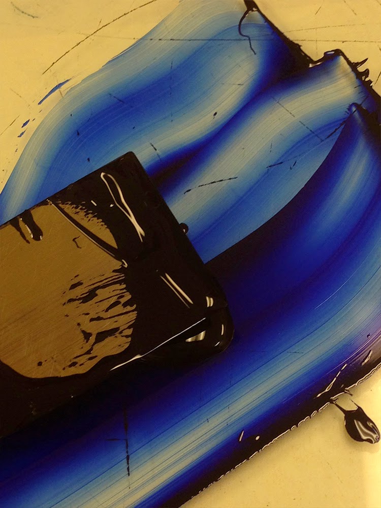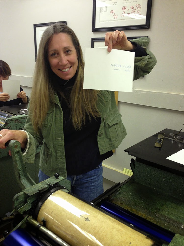 You apply a thick ink to the rollers with a small palette knife when they are not moving and then turn the press on using trip mode. The cylinders move back and forth against each other smoothly distributing the ink across the printing roller’s surface. Then you clamp paper into the press and crank it over the rollers turning around as it goes. The ink is then transferred to the paper via the raised surface of the metal letters (sorts) and voila! you have your print.