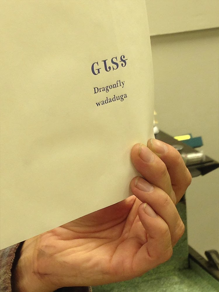 | Cherokee and English words for turtle and dragonfly backwards in the press & ready to ink |