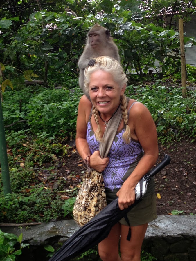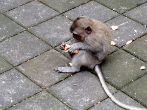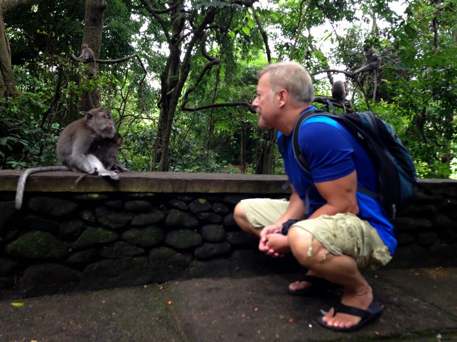 Yes, yes I know that’s not how you spell “monkey” but hey this is my blog and I’ll slaughter the language if I feel like it. Let me say that monkeys are really cute, fun and playful… until they’re not. I saw both sides of that equation during several encounters with our furry little simian buddies the last few months, particularly here on Bali. I should mention that while there are several kinds of monkeys in this general part of the world, unless you go looking, the only kind you are likely to see are Long-Tailed Macaques. About the size of a medium dog maybe. The lesson learned early was “NO FEEDING THE MONKEYS BANANAS” offered for sale by thoughtful vendors nearby trying to make a living. That cute little group of moms and their babies will disappear and you’ll find yourself in the middle of a Horde (I kid you not) of bigger, greedier males and short a few bananas. Then they will be all over you (literally) and demanding more food. You of course will have none and then they will get even more insistent… I think you get the picture.