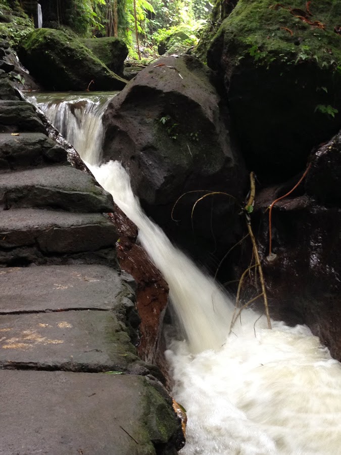 | Beautiful river canyon and sculptures down at the bottom of the Monkey Forest |